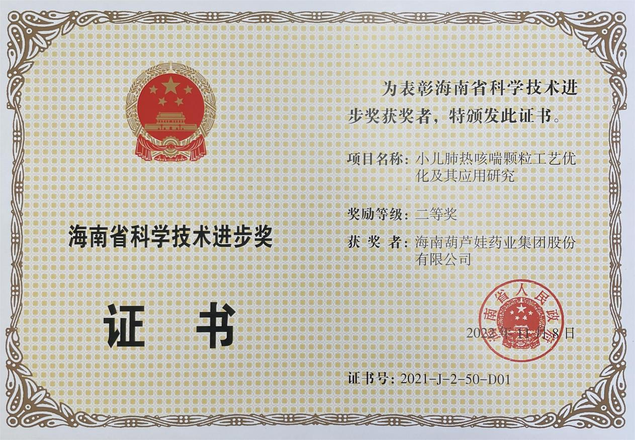 为此,小儿肺热咳喘颗粒的制备方法获得了第二十一届中国专利优秀奖(2019年),专利申请号:ZL201010134951,此次作为专利技术的应用,获得了2021年度海南省科学技术进步奖二等奖。在此之前,人生就是搏牌小儿肺热咳喘颗粒还多次被授予“临床价值中成药品牌”、“中国连锁药店最具合作价值单品”,荣登“中国医药品牌榜”。